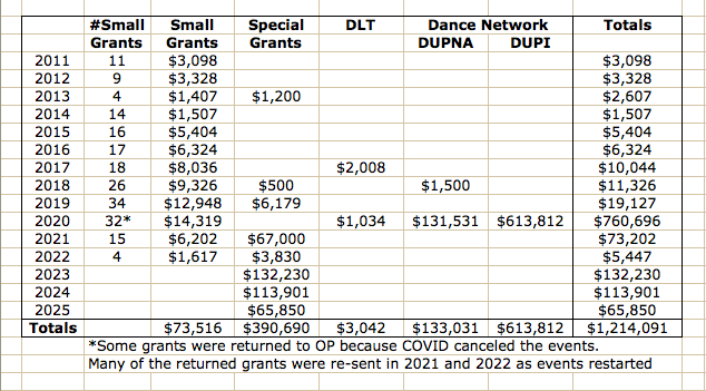 Between January 2000 and December 2008 Oneness Project awarded grants and donations to support the Dances of Universal Peace worldwide. In addition to totals below, OP has also offered thousands of dollars in scholarships to events each year.